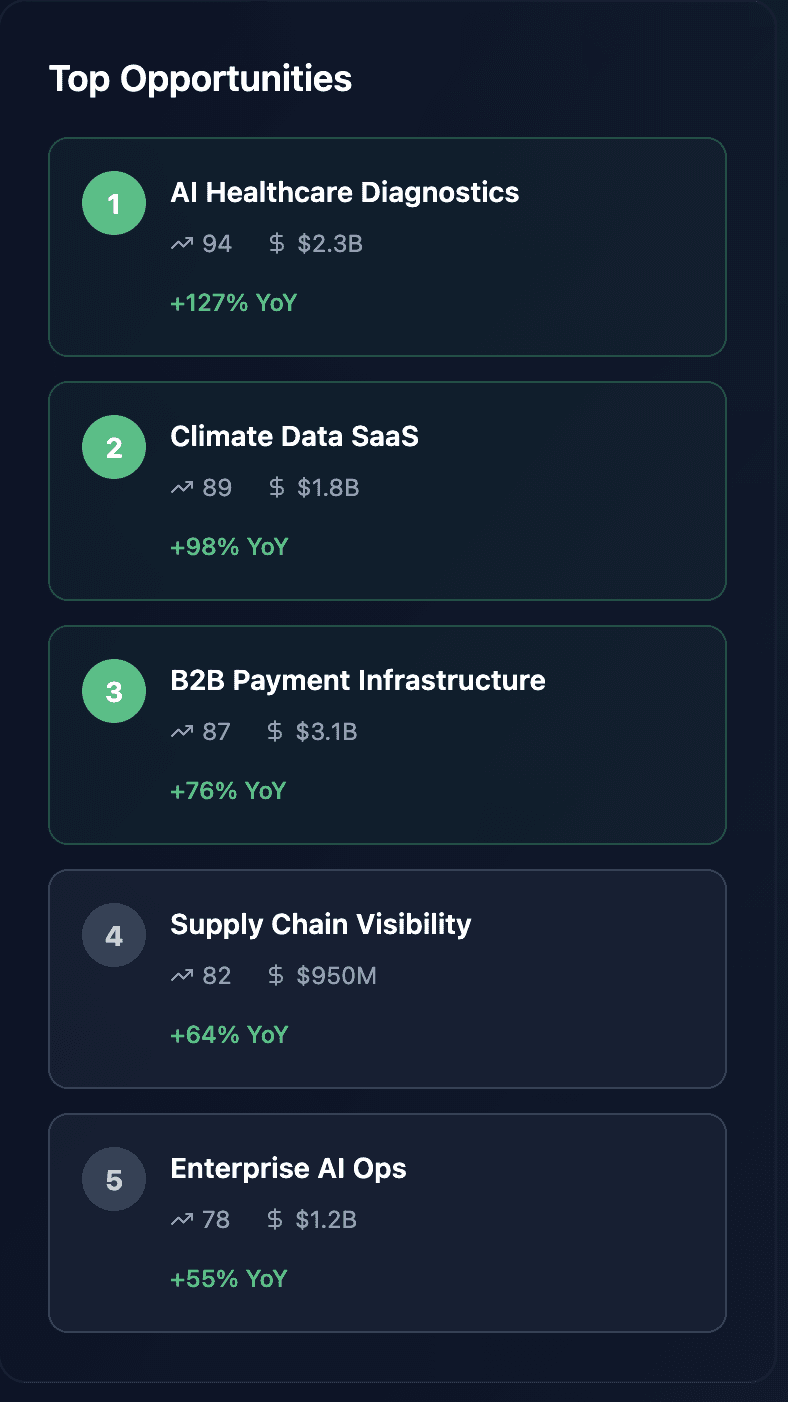 Validated signals are grouped into structured opportunity clusters that reveal concentrated areas of demand. Each cluster synthesizes recurring pain themes, signal intensity, competitive gaps, and viable entry angles into a clear strategic snapshot